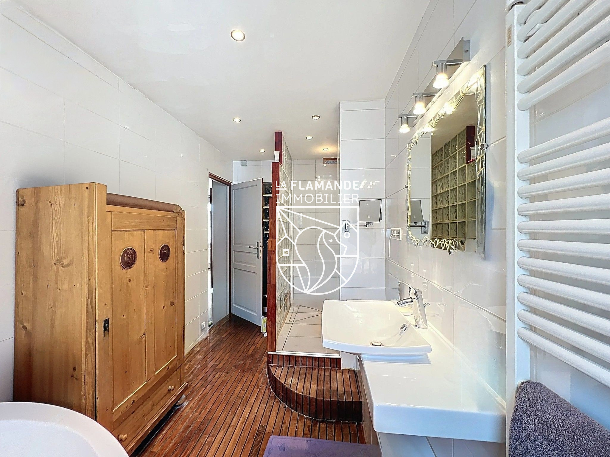 Au 1er étage: une cuisine équipée, une salle à manger et un salon parquetés donnant sur une terrasse en bois exposée SUD (30m2), WC. Un demi étage avec espace bureau.