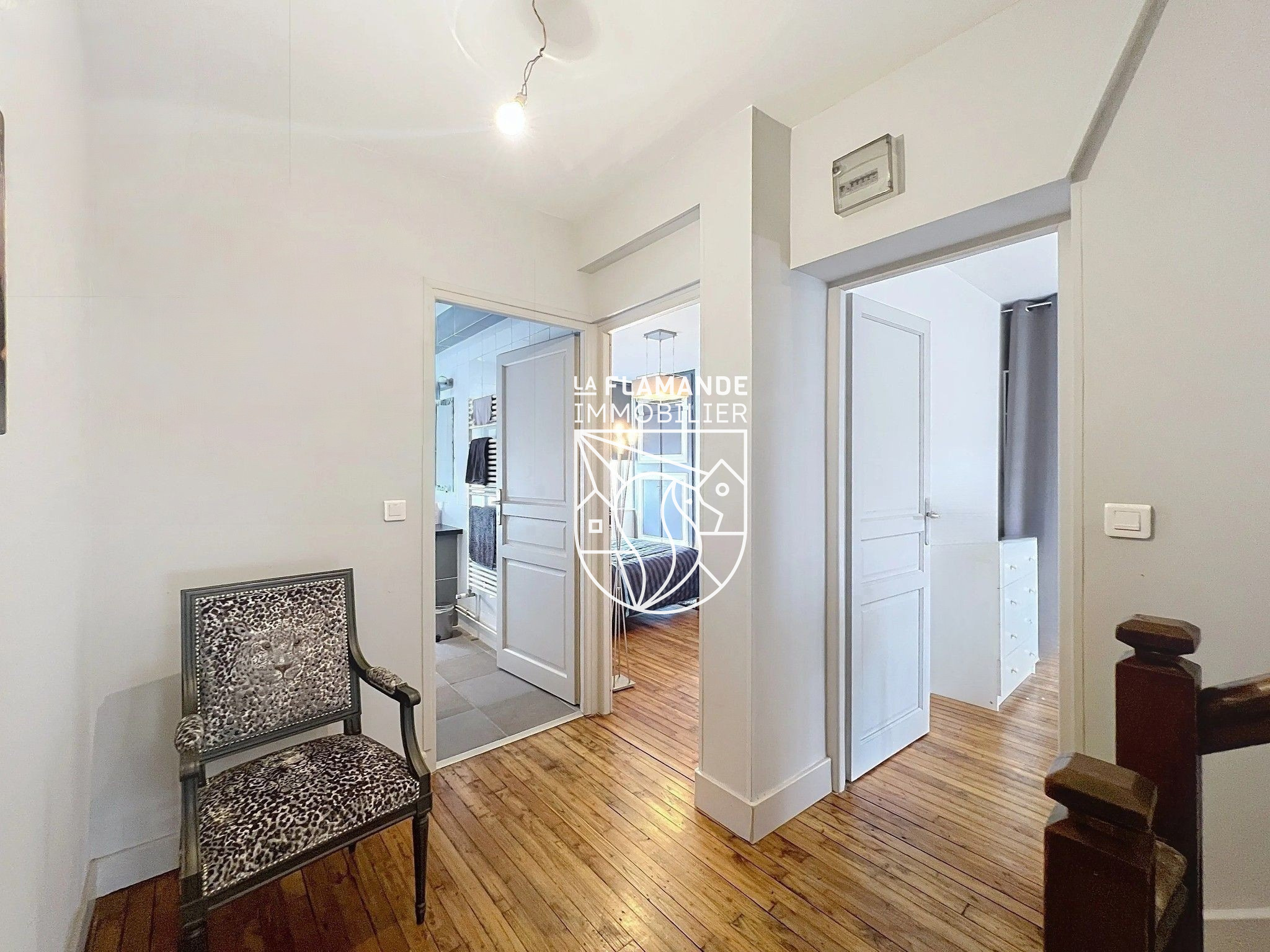 Au second: un pallier dessert 2 chambres (12 et 14m2) et une salle de bains, WC. Au 3étage: une suite parentale de 28m2 avec salle de bains attenante. Un grenier de 30m2, aménageable.